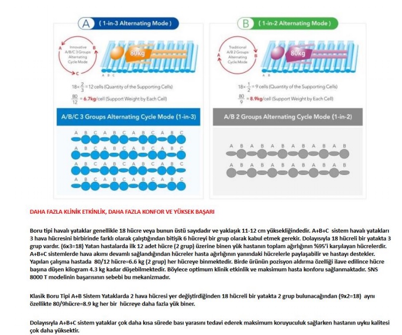 Havalı yatak içerisinde pozisyon alma güçlüğü çeken veya bundan sonraki yaşam kalitesini havalı yatak içerisinde geçirecek kısmi yatağa bağımlı hastalar için dizayn edilmiş bir üründür. SAĞ/ORTA/SOL pozisyonlarda yaklaşık 20-25 derece arasında 8 dakika süreyle otomatik olarak kişiye pozisyon aldırır.Bu sayede günün her saatinde hastanızı yatak yarası riskinden uzaklaştırır ve varsa açılmış olan yatak yarasını tedavi edersiniz Bu korumayı hem 24 saat boyunca yaparsınız hemde hastanızı gece uykusundan uyandırmamış olursunuz.Kişinin kilogramını manuel olarak ayarlayabilirsiniz ve kişiye ideal konfor sağlamış olursunuz. Yeni havalı yatak basınç ayarlama sistemini A+B+C hava tüplerinin ayarlamasını yapabilirsiniz.Bu son yeni teknoloji ile bası yaraları tedavisinde ve korunmasında, ayrıca hasta bakımında tüm istenilen özellikleri hepsini bir arada üzerinde toplayan yeni jenerasyon bir üründür.