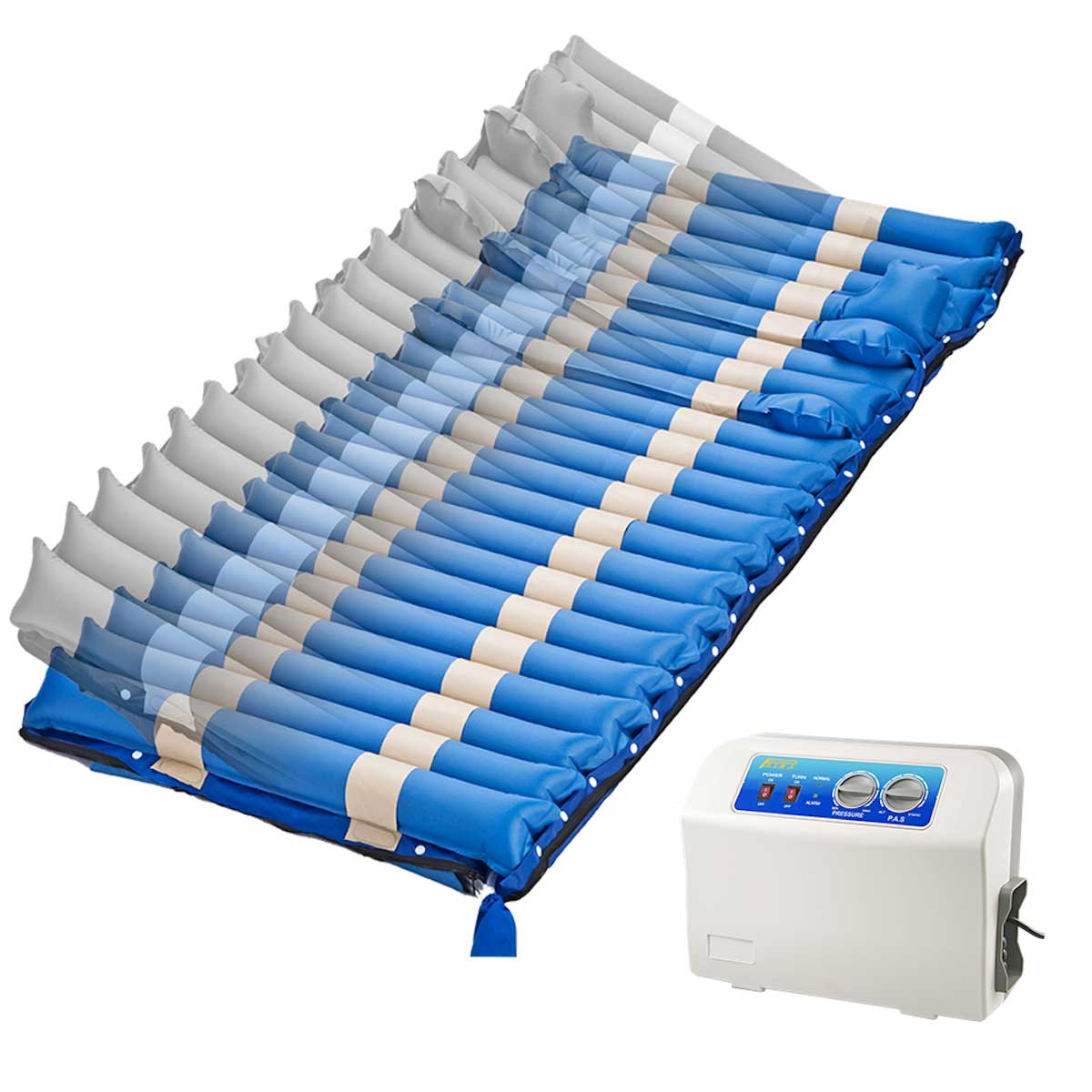 Ayrıca pozisyonlu havalı yatak üzerinde bir çift CPR(Acil boşaltma sistemi)bulunmaktadır ve bu sayede hastanıza acil müdahale gerektiği zaman sistem yapılacak müdahaleye engel olmaz.Şilte üzerindeki hava borularının delinmesi,patlaması durumunda sadece ilgili hücreyi değiştirerek sistemi çok uzun yıllar kullanabilirsiniz.Motor üzerindeki ALARM bölümünde ise sistemde düşük basınç veya herhangi bir arıza durumunda size görsel olarak alarm verir ve bu sayede diğer birçok sistemin aksine hem hastanızın en ideal şekilde bası yarasından korunmasını veya varsa açılmış bası yarasının tedavisine yardımcı olup hemde hastanızın sistemden en iyi şekilde faydalanmasını sağlamış olursunuz.
